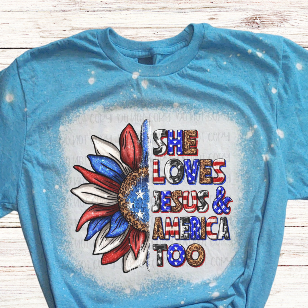 Sunflower She Loves Jesus Bleached 4th of July Shirt
