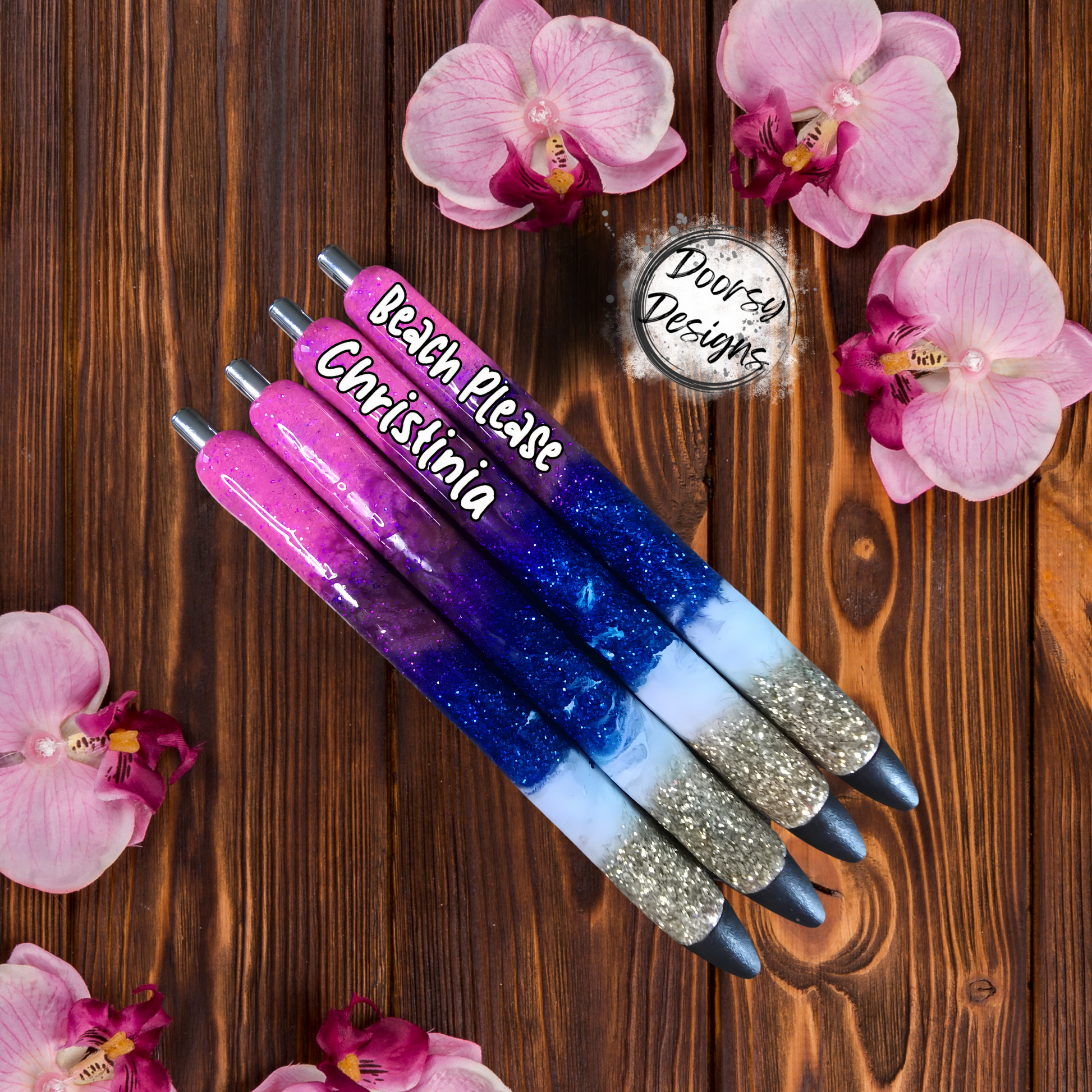 All pens are glittered with a high-quality glitter and sealed with a glass-like finish, pens will be slightly thicker than an original Paper Mate Inkjoy Gel Pen as they are epoxy coated. All pens are hand glittered. No two pens are exactly alike. Alcohol ink in used to create the waves that you see on the pen.